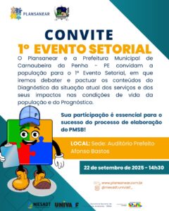 A Prefeitura Municipal de Carnaubeira da Penha, em parceria com o Plansanear, convida toda a população para participar do 1º Evento Setorial do Plano Municipal de Saneamento Básico (PMSB).